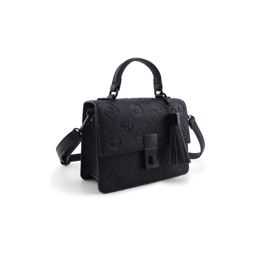 Step out in style with this elegant black embossed handbag crafted from premium faux leather. Its structured silhouette features a sleek top handle, detachable crossbody strap, and a bold tassel accent for a modern touch. The embossed pattern adds sophistication, while the secure front clasp keeps your essentials safe. Perfect for day-to-night wear, this bag effortlessly complements any outfit with its refined charm and versatile design.